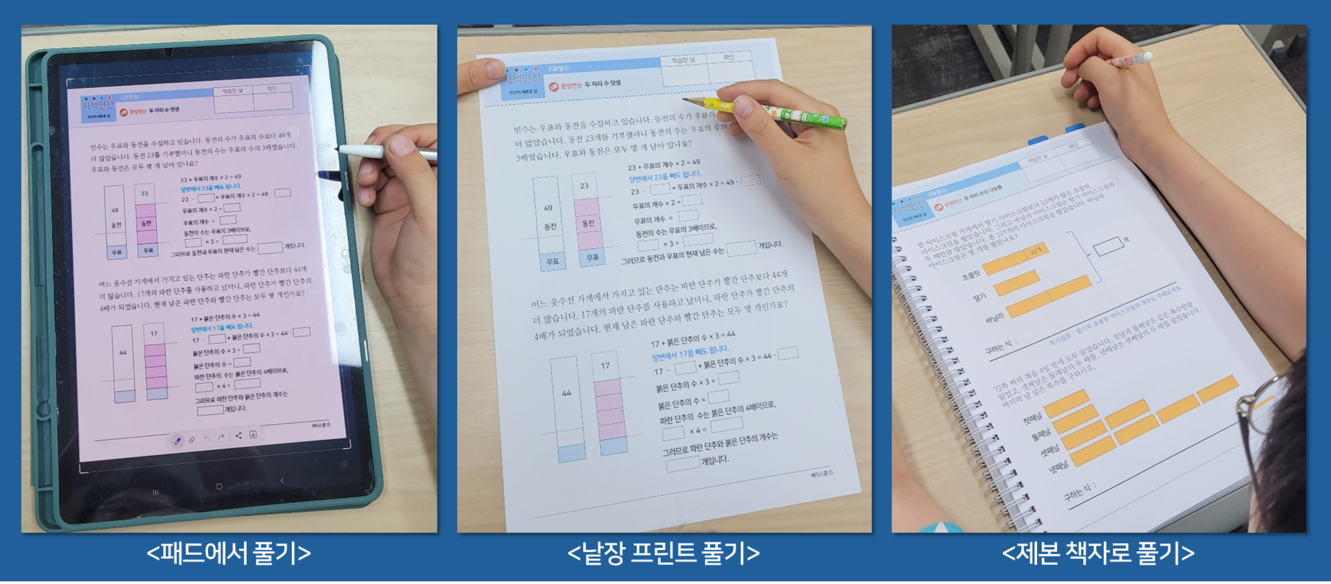 그리하여 당연히 다른 연산교재와는 많이 다르고 익숙하지 않을 것입니다. 그러나 모든 새로운 것은 처음에는 낯설게 보입니다. 그 낯설음을 낯익은 방식에 추가로 적용하면 극강의 학습 효과를 얻을 것이다.