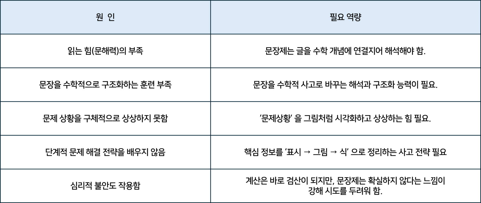 문장제 문제를 어려워하는 이유가 있습니다. 수학적 문해력만이 아닙니다. 아래의 몇 가지 원인이 복합적으로 작용하기 때문입니다.